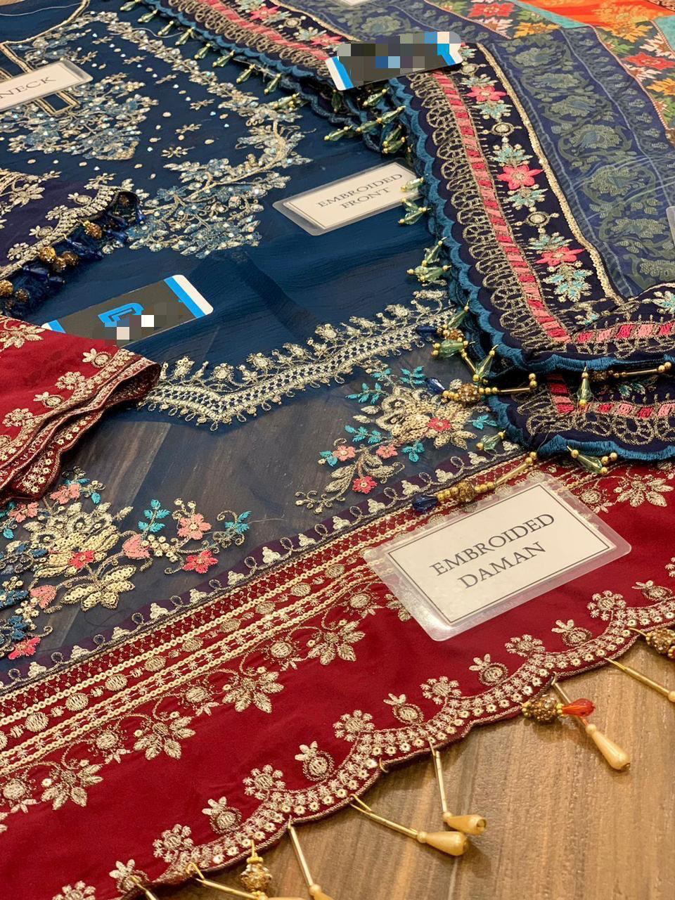*chiffon fully heavy embroidered spengle work centre panel front with hand emblishment work with 2 type heavy embroidered spengle work daman boarder with heavy fancy tulses attachment with plain side panel with heavy embroidered spengle work side panel bunches*